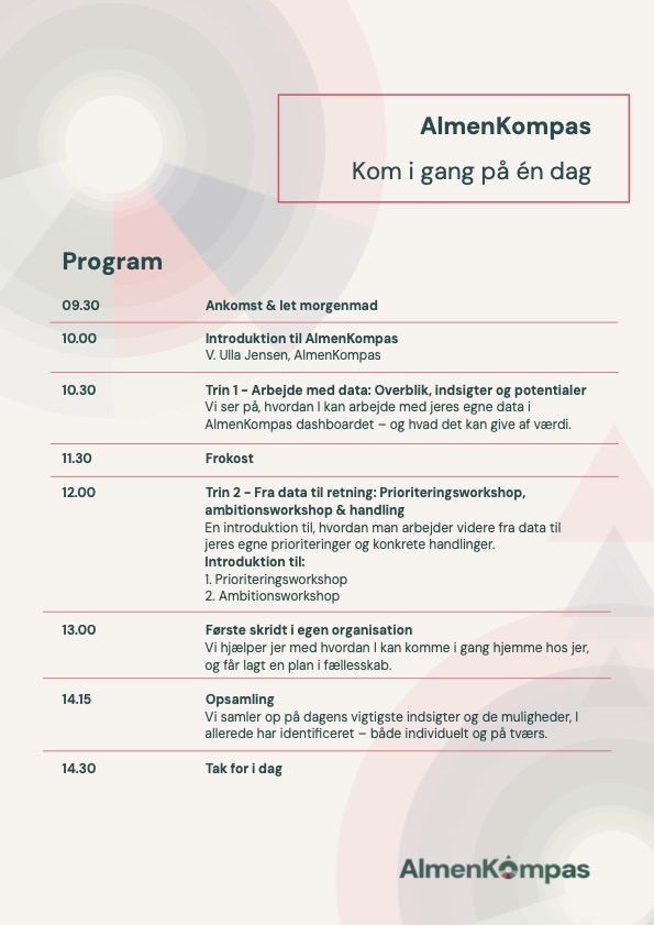 På dagen får I et samlet og praksisnært indblik i, hvordan AlmenKompas kan bruges i jeres egen organisation. I bliver introduceret til både metoden og værktøjerne, og I arbejder konkret med, hvordan AlmenKompas kan skabe retning, styrke dialogen og understøtte beslutninger med data.