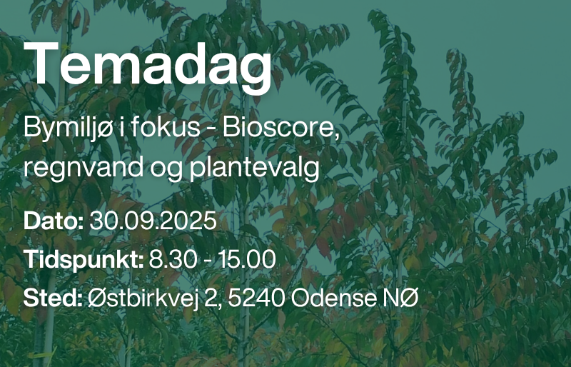 BG Byggros præsenterer løsninger til regnvandshåndtering på tag og dæk, og Kortegaards Planteskole tager os med en tur i marken, hvor vi får et indblik i kvalitet, sorter, dansk træproduktion, samt et kig på, hvordan vi registrerer klimatal på træerne – og hvilke tal, der kan leveres.