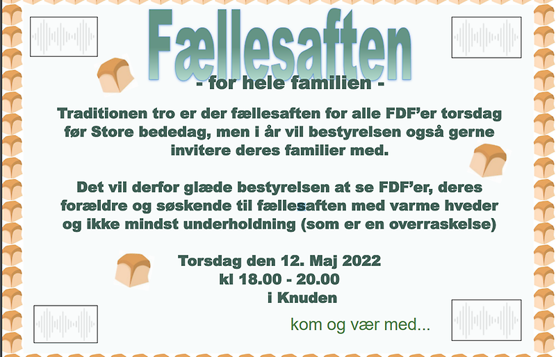Det vil derfor glæde bestyrelsen at se FDF'ere, deres forældre og søskende til fællesaften med varme hveder og ikke mindst underholdning (som er en overraskelse)