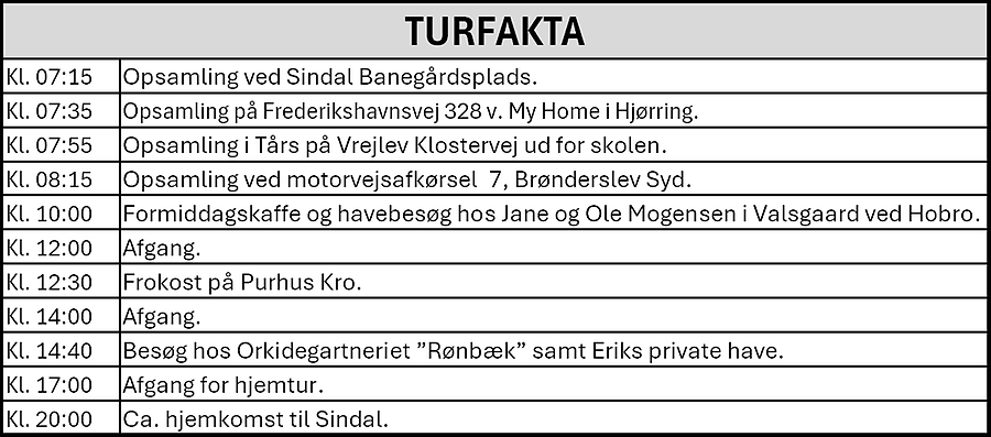 I år går den traditionsrige bustur til familien Schwartz’s store orkidegartneri “Rønbæk”, i Hinnerup, hvor vi dels skal opleve, hvordan der producers orkideer i tusindvis, men også nyde indehaver Eriks egen private have. I gartneriet er der mulighed for at købe orkideer med hjem samtidig med at vi får vores eftermiddagskaffe med kringelkage.