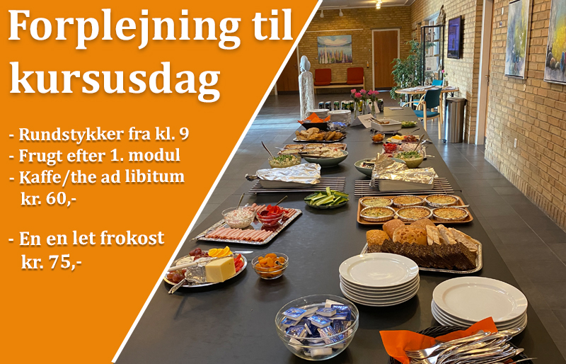 Rundstykker, frugt efter 1. modul og kaffe/the á libitum hele dagen - kr. 60,-.